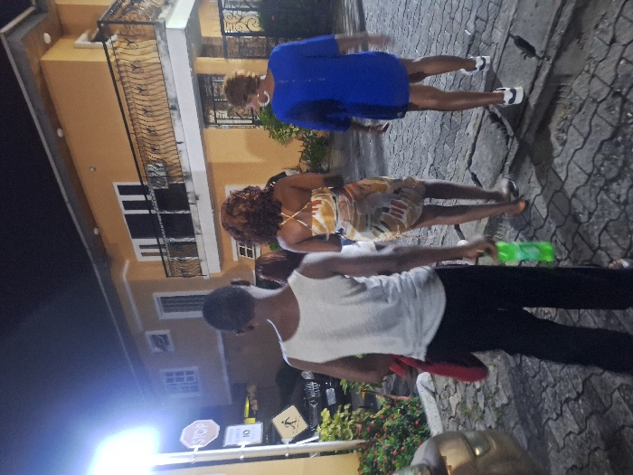 Three individuals walk along a paved area near a yellow building at night. A man in a white tank top and black pants carries a green bottle. Behind him is a woman in a patterned dress. Further back, a woman in a blue dress walks with white shoes. Signposts with pedestrian symbols and "10" are visible. The building has windows, a black balcony railing, and a dark roof line. The lighting is dim, casting long shadows.