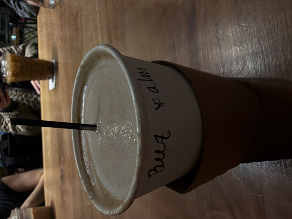 A paper cup filled with a light-colored beverage sits on a wooden surface