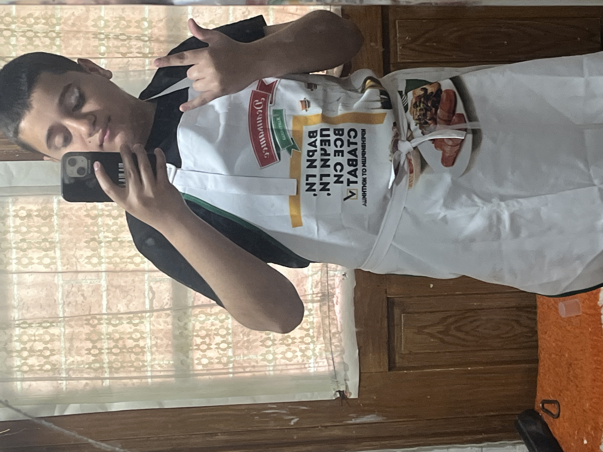 An adolescent male is depicted in a mirror selfie, positioned indoors in Lozarevo, Bulgaria. He has short, dark hair and is wearing a black t-shirt under a white apron with a green trim. The apron displays Cyrillic text, including "БУРГАС" (Burgas) on a green banner and reversed text possibly reading "САВАТА Е СВЕЖ, ПРЕСЕН, МЛЯН И ПЕЧЕН" (SAVATA IS FRESH, GROUND, MILLED AND BAKED) along with graphics of cooked food items such as bacon-wrapped sausages. The individual holds a black smartphone in his left hand, angling it to capture his reflection. His right hand is raised, forming a "rock-on" gesture. Behind him, a window is visible, covered by a translucent, patterned curtain, through which a red brick exterior wall is faintly discernible. To the left, a wooden door frame or paneling is present, showing some white splatters. The floor in the foreground is covered with an orange, shaggy rug, on which a dark, rectangular object and a small, clear plastic cup are placed.