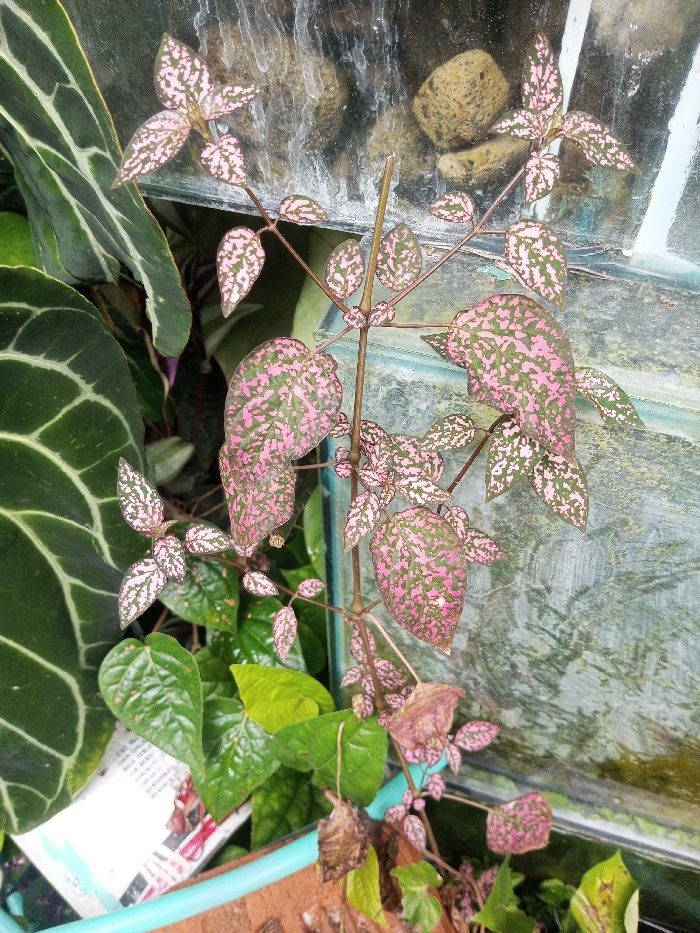 The image depicts a close-up of botanical elements within a contained or sheltered environment, reportedly in Khammam, India. Dominating the central frame is a plant, identifiable as *Hypoestes phyllostachya*, with numerous ovate leaves exhibiting a distinct pink and dark green speckled variegation. Its slender, brownish stem and branches ascend diagonally from the lower right. To the left, a large, dark green leaf with prominent light venation, consistent with an *Anthurium* species, is partially visible. The background features a transparent glass surface, marked by streaking or moisture residue. Behind the glass, multiple light brown, rounded stones are discernible. The lower section of the image shows a segment of a light blue tubular object, a brown, planar surface, and additional smaller green foliage. A white, rectangular object with dark printed text is partially visible in the lower left quadrant. Several leaves near the base of the variegated plant appear desiccated. No human subjects or discernible actions are present.