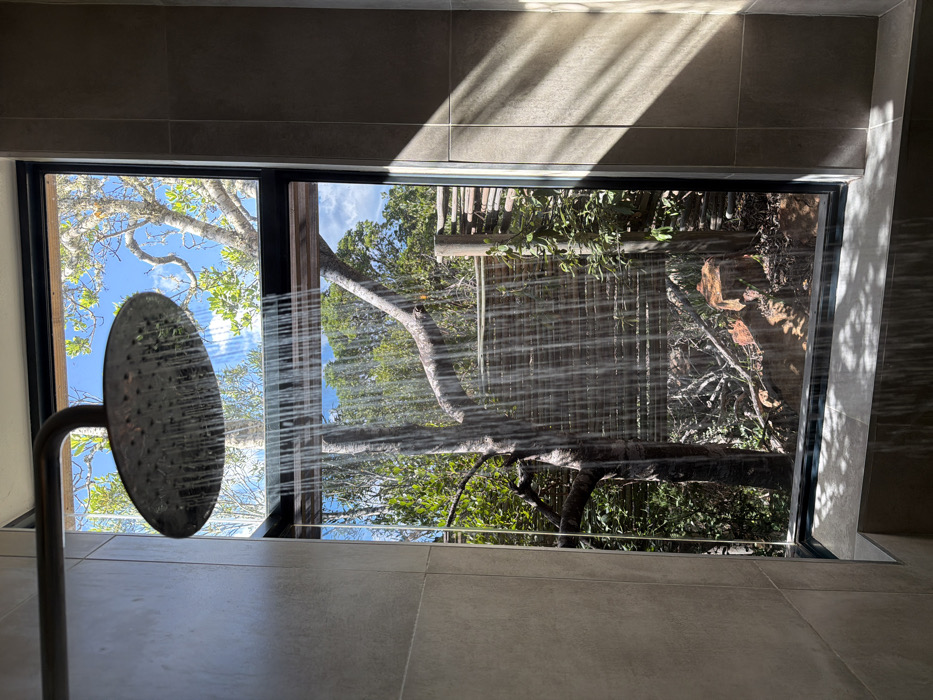 The image displays an active shower enclosure with a panoramic view of an outdoor natural environment in Hessequa Nu, South Africa