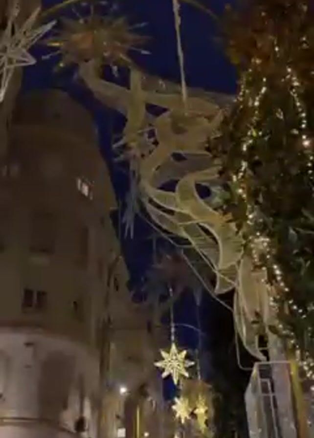 street at night illuminated by Christmas decorations. Overhead, there are large, elaborate light installations in the shapes of stars and abstract designs, connected by a large golden hoop. Buildings line the street on either side, and one has a rounded corner tower. Trees are visible, some with fairy lights. People are walking along the street. The sky is a dark blue.