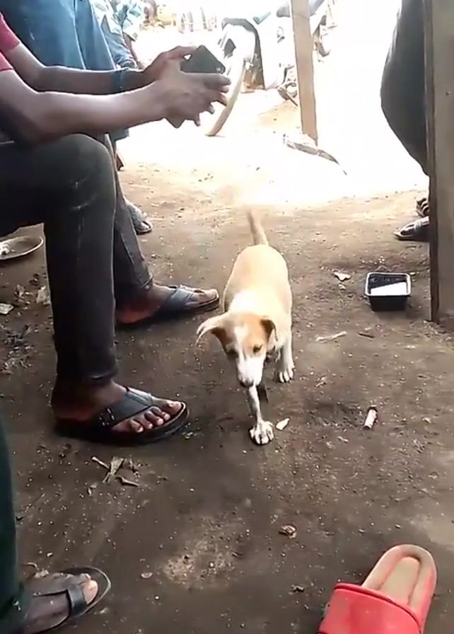 small brown and white puppy on a dirty, cement-like ground, moving between the feet of seated people. The puppy has a small black collar, is sniffing around, and wagging its tail. Several pairs of sandals are visible around the puppy. A red slide sandal lays on the ground. A person in jeans is holding a phone in their hand. The area appears to be under a rudimentary shelter. There are other objects and debris scattered on the ground.