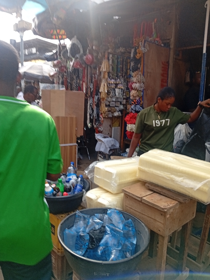 The image depicts an outdoor market scene in Fegge, Nigeria. In the foreground, the back of an individual wearing a bright green t-shirt is visible, facing away from the camera. To their right, a dark-skinned woman with dark hair stands behind a market stall. She is wearing a dark green t-shirt with the white inscription "1977" and a cross symbol on the chest. Her left arm is raised and resting on an unseen object to her right, while she looks downwards. The market stall features various merchandise. Behind the woman, a wall display is covered with numerous accessories including necklaces, bracelets, hair ornaments, and other small items, hung on hooks and arranged on shelves. The items display a range of colors including red, white, black, and metallic hues. In front of the stall, several commercial items are arranged. On a low wooden structure, multiple large, clear plastic-wrapped stacks of white, rectangular containers, possibly disposable food packaging, are visible. Below and to the left of these stacks, a large black bucket contains numerous individual portions of liquid in blue plastic sachets, along with some black plastic bags. To the immediate left of this bucket, another black basin holds various bottled beverages, including water and soft drinks, as well as a few smaller cartons. The background is partially obscured by bright sunlight and glare in the upper right. Visible elements include other market structures, parts of canopies or umbrellas, and blurred figures of other individuals, indicating an active commercial environment. The lighting is strong, suggesting an outdoor daylight setting.