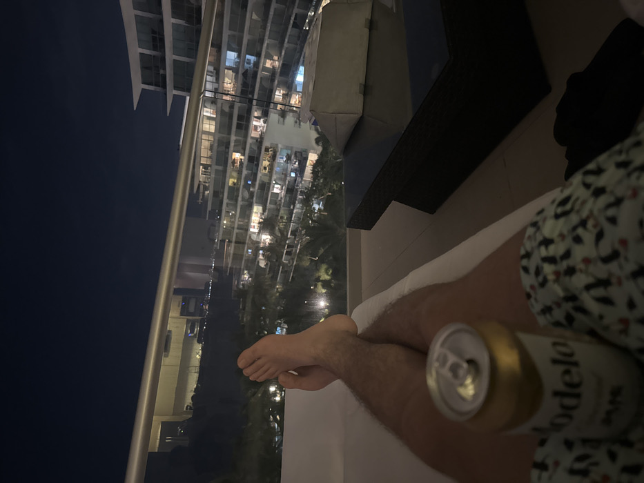 At night, a man reclines on a balcony, holding a Modelo beer can. His legs, crossed at the ankles, are visible. A white towel or blanket is beneath him. In the background, a multi-story building, possibly a hotel or apartment complex, is illuminated with many lights. Trees can be seen between the building and the balcony. The balcony features a glass railing and dark furniture. The sky is a dark blue.