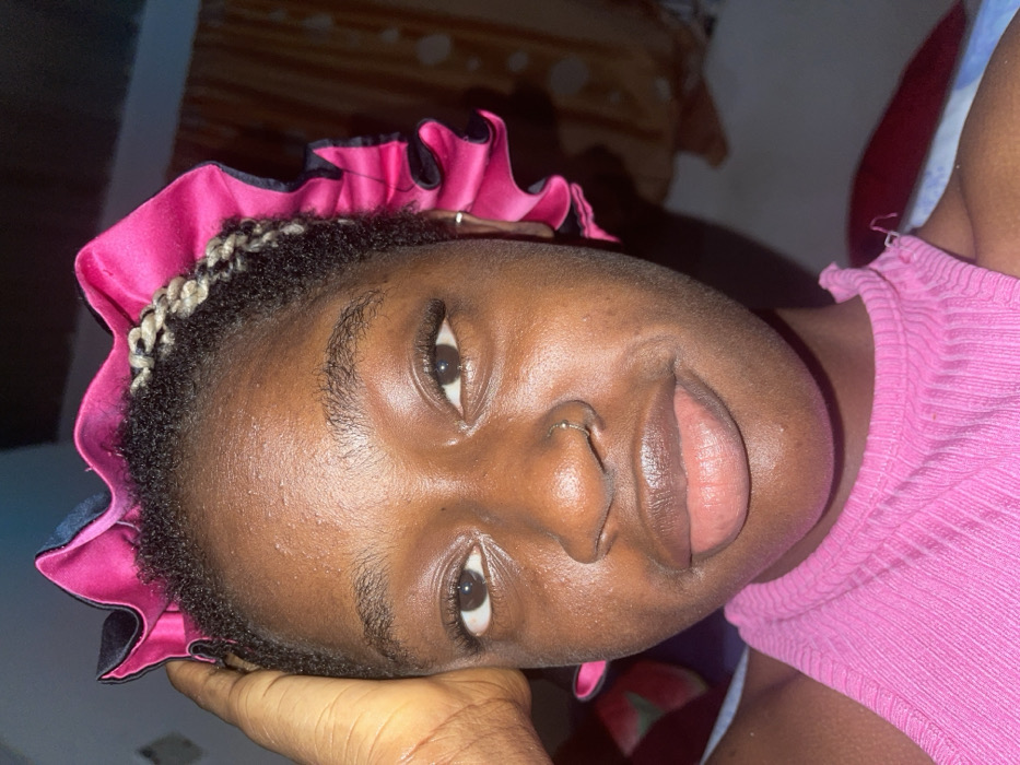 A dark-skinned person with brown eyes and a nose ring is looking at the camera. They have light-colored braids near the forehead under a pink satin bonnet with black trim. They wear a pink ribbed top and rest their head on a hand. The background appears to be an interior with bedding and a wall or furniture partially visible. The image has soft lighting and is rotated counterclockwise.