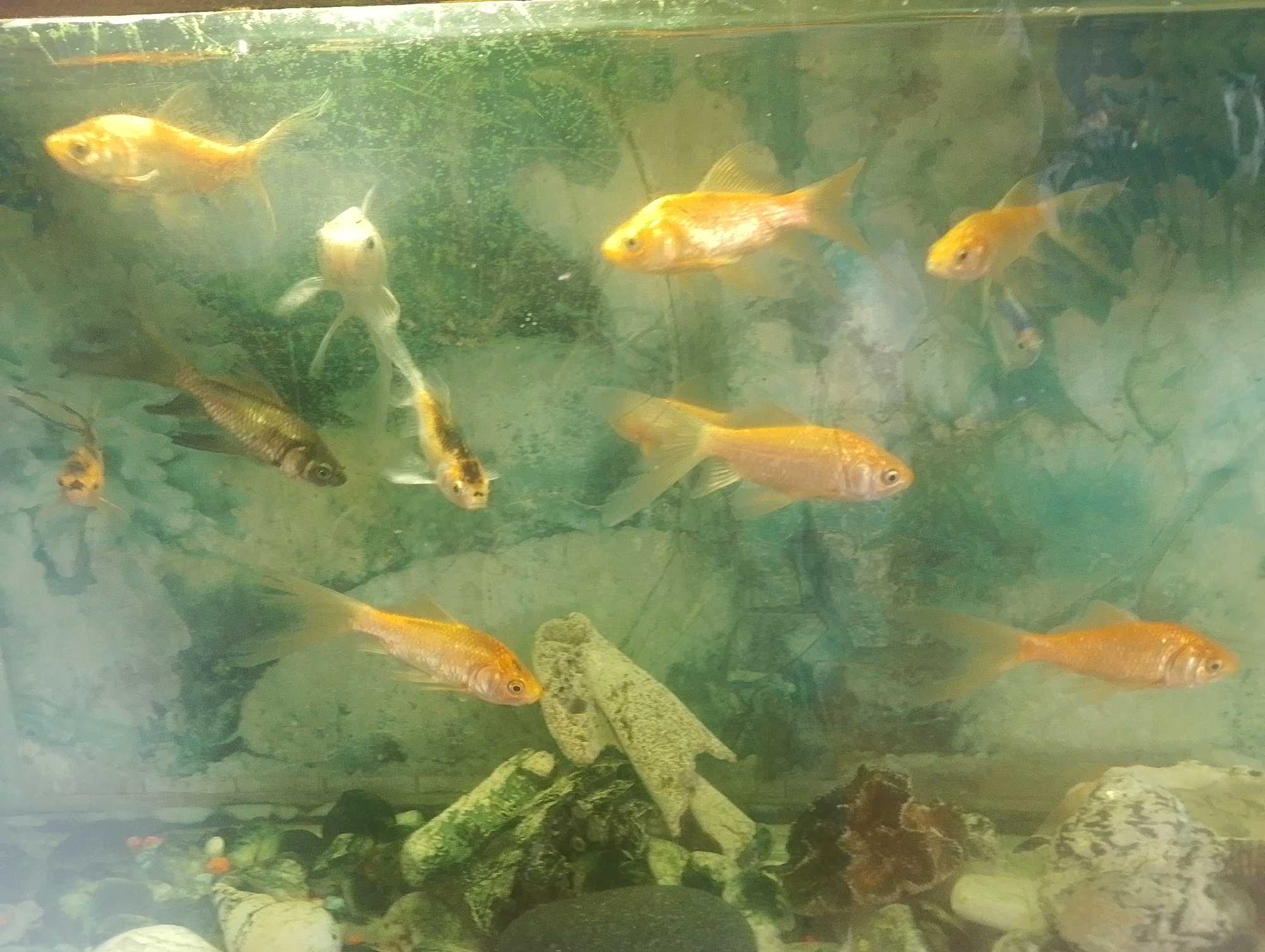 An aquarium in Caracas, Venezuela containing approximately 10 goldfish of varying sizes and colors (primarily orange and white)