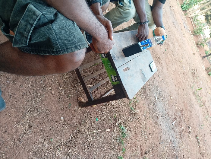 Two people are sitting outside, one wearing denim shorts and the other khaki pants. A small wooden table separates them, holding a smartphone, a water bottle, and another electronic device. The table has a green and white design on its side. The ground is a mix of dirt and dry grass. The scene has a casual, outdoor feel.
