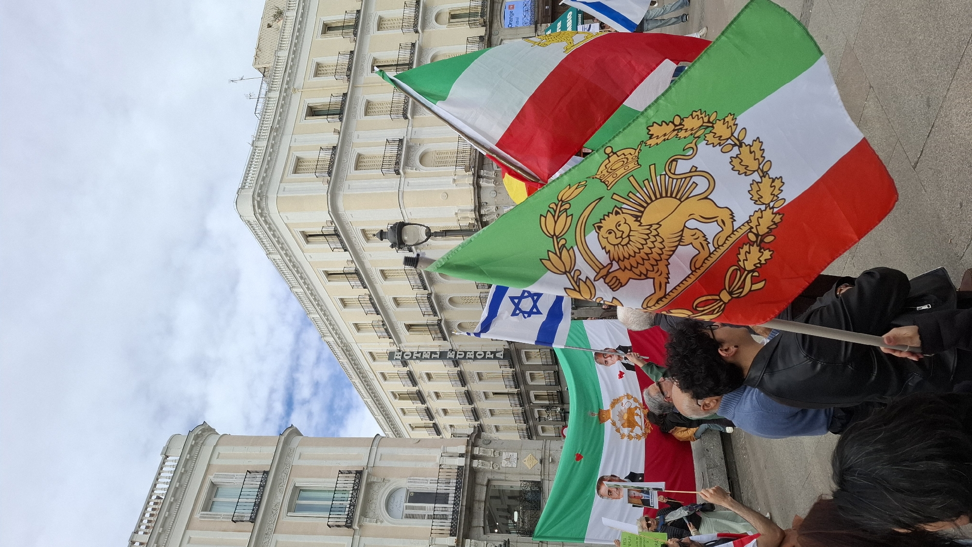 The image depicts a demonstration in Madrid, Spain, judging by the architecture of the buildings in the background and the signs and flags being waved by the demonstrators. The Hotel Europa is also visible. Several people are holding up flags, including the former flag of Iran (green, white, and red with a lion and sun emblem), the flag of Israel (blue and white with a Star of David), and a Spanish flag (red and yellow). The demonstrators are of varying ages and ethnicities. They appear to be protesting a political issue. Some signs are visible, but the text is obscured. The sky is overcast with clouds.