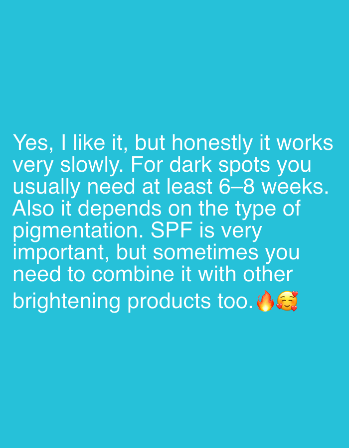 The image displays a text overlay on a solid cyan background. The text states, "Yes, I like it, but honestly it works very slowly. For dark spots you usually need at least 6–8 weeks. Also it depends on the type of pigmentation. SPF is very important, but sometimes you need to combine it with other brightening products too." There are also two emojis, a flame and a face with heart eyes, at the end of the text. The image has no identifiable location, and the text discusses skincare or beauty product use, not a physical location or subjects in Esenyurt, Turkey.