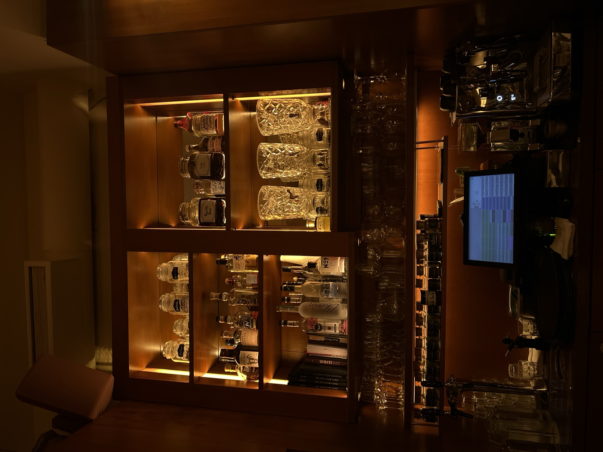 This image captures the interior of a meticulously organized bar counter within a commercial establishment located in Vienna, Austria. The scene is illuminated by warm, localized lighting originating from recessed LED strips within wooden shelving, casting an intimate and dim ambiance over the entire area. The background consists of multi-tiered wooden shelving units. The upper left shelves display numerous clear glass jars with handwritten labels such as "Vanilla Rum," "Coffee Gin," and "Kardamom Angostura," alongside various liquor bottles including "Monkey Shoulder" whisky, "Toki" whisky, "Chopin" vodka, "Grey Goose" vodka, and "N°9" gin. A stack of cocktail and spirits-themed books is also visible on these shelves. The upper right shelves feature more labeled glass jars and three prominent, ornate cut-glass beverage dispensers equipped with spigots. Below these, multiple shelves are densely packed with a variety of clean, empty glassware, including wine glasses, tumblers, and stemmed cocktail glasses, arranged for service. The lower section reveals a bar countertop. On the left, a stainless-steel beer tap with a single spigot stands on a drip tray, surrounded by stacks of tumblers. In the center, a Point-of-Sale (POS) terminal displays a colorful, grid-like interface on its screen. To the right, a professional-grade, chrome-finished espresso machine with multiple group heads is positioned next to a coffee grinder, indicating coffee service. A continuous row of smaller labeled bottles, likely containing bitters or syrups, runs along the backsplash of the counter. The overall scene suggests a well-maintained, high-end bar or cocktail lounge prepared for operation, devoid of any visible individuals or ongoing activity.