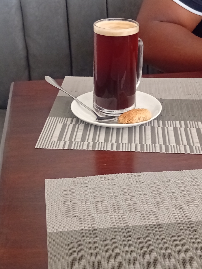 The image depicts an indoor scene, characteristic of a cafe or restaurant setting, in Murang'a, Kenya. A polished dark brown wooden table surface dominates the foreground. Two woven placemats are visible; the upper one features a pattern of alternating light grey and dark grey vertical stripes, while the lower is solid light grey with a textured weave. A white circular saucer rests on the upper placemat, holding a tall, clear glass mug filled with a dark, reddish-brown beverage topped with a thin layer of light foam. A silver spoon lies diagonally on the saucer. Adjacent to the mug, a single, oval-shaped, light brown cookie is present on the saucer. In the background, a dark grey upholstered booth seat with vertical channel tufting is visible on the left. On the right, the upper arm and shoulder of an individual with brown skin are partially seen, wearing a garment with a white and dark-colored stripe.