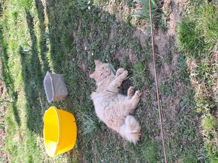 The scene is set outdoors in Spanchevtsi, Bulgaria. A long-haired, light orange/cream-colored cat lies on its right side on sparse grass and bare soil in the foreground, facing the viewer with partially closed eyes. In the upper left background, a bright yellow, round plastic basin sits on the ground, positioned to the left of a rectangular, light grey perforated plastic container. Both containers appear empty. The ground exhibits patchy green grass interspersed with areas of exposed soil and small, unidentified plants. A thin, dark rod-like object extends horizontally across the lower-mid ground. Shadows indicate direct sunlight.