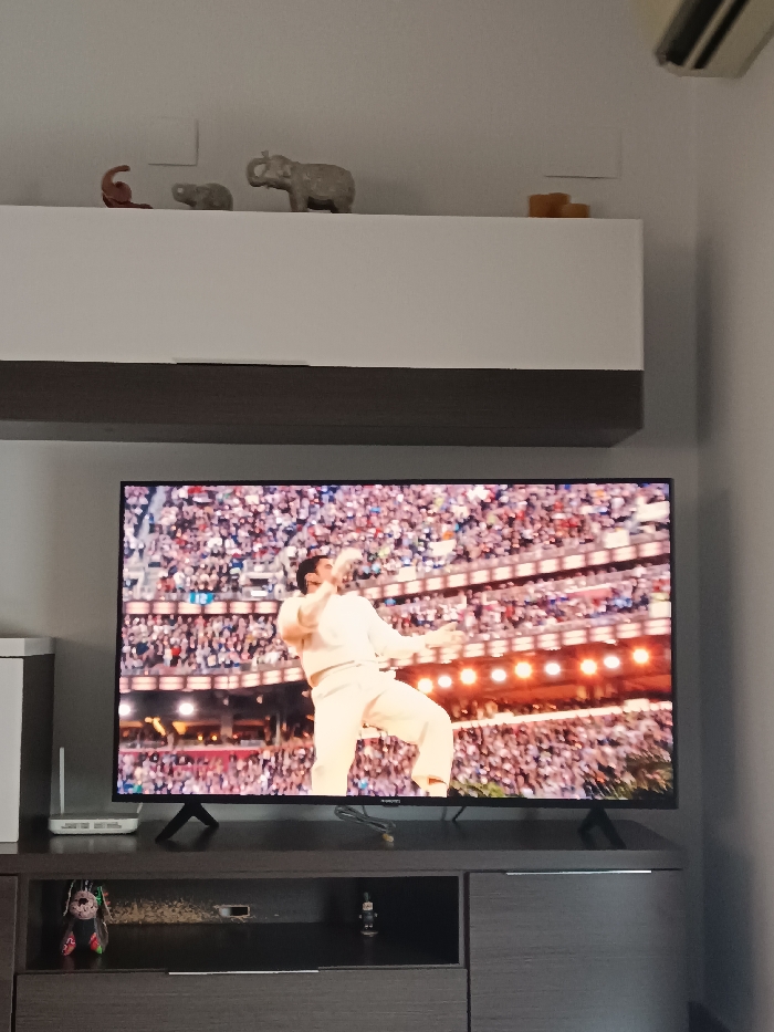 The image depicts an interior scene in a residential setting in Sagunto, Spain, likely a living room. A large, black flat-screen television with a visible "Hisense" logo is centered, resting on a dark brown media console featuring two drawers with horizontal silver handles and an open central shelf. The television displays a dynamic image of a man in light-colored attire, mid-action with arms raised, on a stage or field in front of a densely packed stadium audience under bright lights. To the left of the television on the media console, a white Wi-Fi router is visible. Within the open shelf of the console, from left to right, a small colorful knitted doll, a scattering of light-colored granular material, and a small dark figurine are present. Above the television, a wall-mounted two-tiered shelf unit is affixed to a light-colored wall. The bottom tier is dark brown, and the top tier is white. On the white top tier, from left to right, are a reddish-brown abstract figurine, a small grey elephant figurine, and a larger grey elephant figurine with a raised trunk. Further to the right on the same shelf, two small light brown cuboid objects are visible. An air conditioning unit is partially visible in the upper right corner of the frame. Faint rectangular adhesive marks are present on the wall above the wall-mounted shelf.