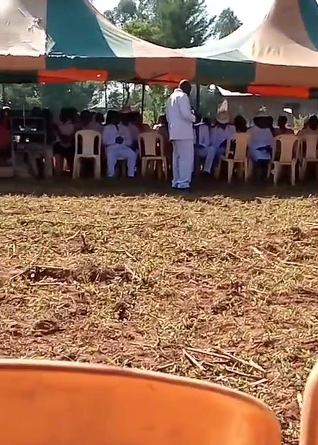 gathering of people outdoors, likely at an event. They are seated under a large tent with green, orange, and white patterns. Many attendees are wearing white clothing. A man in a white suit is standing and appears to be addressing the group, possibly giving a speech or leading a ceremony. The ground is brown with patchy grass, suggesting an outdoor setting. Another man is walking behind the seated people. A piece of orange plastic is in the foreground, perhaps a chair or container, partially obstructing the lower part of the view. Audio suggests music playing in the background. The scene appears relaxed and somewhat formal, indicating a possible religious event or a community celebration.