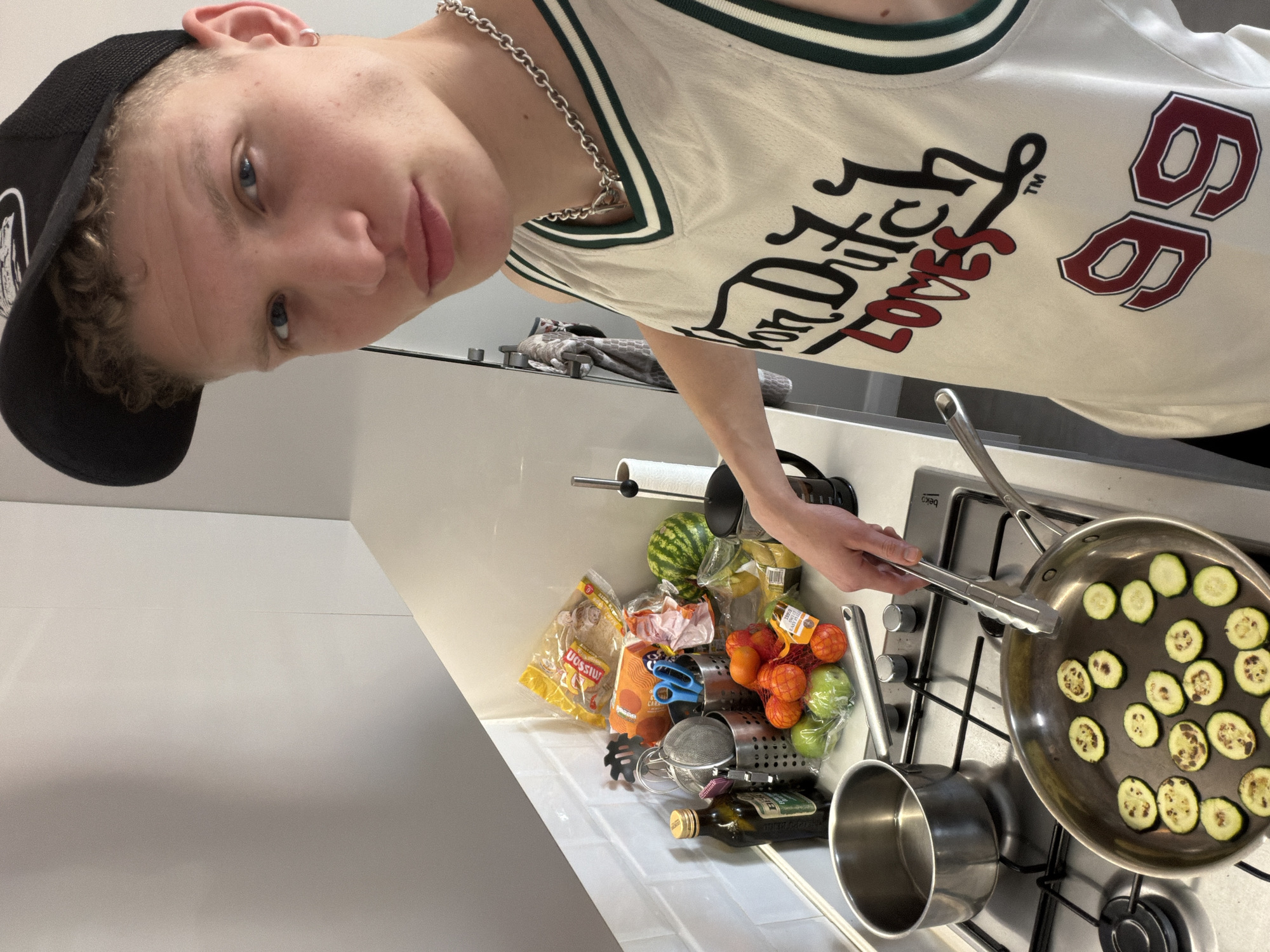 The image displays a young adult male standing in a modern kitchen, performing a cooking activity. He is positioned slightly right of center, looking directly at the viewer with a neutral expression. The individual has fair skin, light curly hair partially visible under a black baseball cap worn backward, and blue eyes. He wears a silver chain necklace and a cream-colored sleeveless jersey with green trim, featuring "Von Dutch Loves" in black and red, and a large red number "99". A silver hoop earring is present in his left ear. The kitchen, identified as being in London, United Kingdom by the visible "Tesco" branding on a fruit net, features a white countertop and a white subway tile backsplash. A built-in "Beko" brand four-burner gas hob is in operation. On the front-right burner, a stainless steel frying pan contains numerous slices of zucchini, some exhibiting browning. The man holds stainless steel tongs in his right hand, positioned over the frying pan. A small stainless steel saucepan rests on the back-left burner. To the left of the stove, a bottle of olive oil and a metal utensil holder containing various kitchen tools, including scissors and a metal sieve, are arranged. Further along the countertop, a collection of groceries includes green apples in a net bag, small oranges or tangerines in a red net bag (displaying a "Tesco" label), a small watermelon, bananas, and red tomatoes. Packaged bread products, one labeled "Olsson," are stacked behind these items. A black French press coffee maker and a roll of paper towels are situated on the right side of the counter. The background consists of light grey walls and cabinetry.