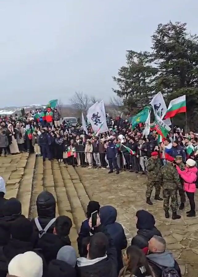 crowd of people gathered in front of a large stone monument with a backdrop of snow-capped mountains under a cloudy sky. Many people are holding Bulgarian flags, along with other flags that include an image of a lion. Soldiers in camouflage uniforms and red berets are positioned around the area, including on the monument's steps. Wreaths are placed on the steps. People are filming with their phones. Some are wearing hats and winter clothes. The ground is paved with stone. There are trees visible behind the crowd.