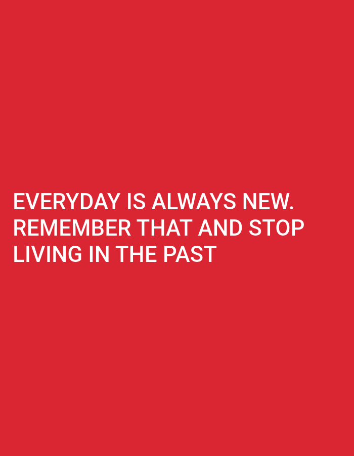 The image displays white sans-serif text centered on a solid red background. The text reads: "EVERYDAY IS ALWAYS NEW. REMEMBER THAT AND STOP LIVING IN THE PAST." No individuals, distinct objects, or discernible actions are present. The environmental setting is a digital display or print, located in the city of Unknown, Unknown.