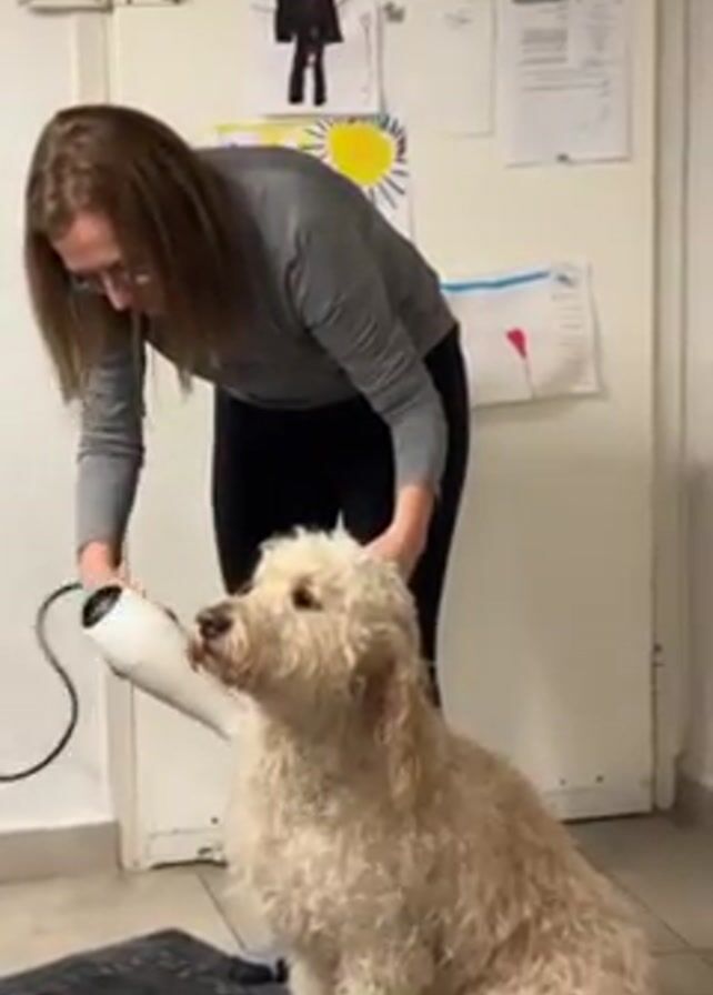 A woman is drying a dog with a hairdryer. The woman is wearing glasses, a grey long sleeve shirt and black leggings. She is bending over and directing a white hairdryer towards the dog. The dog is light brown, curly haired and sitting on a grey towel. The background consists of a white door with children’s drawings on it, a white tiled floor and a glimpse of a power outlet.