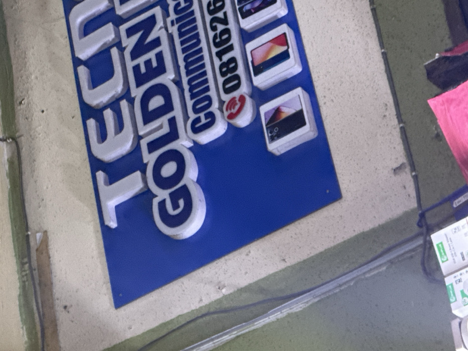 A blue commercial sign is prominently displayed on a light-colored, textured wall in Fegge, Nigeria. The sign features white 3D lettering that reads "TECNO" (partially visible), "GOLDEN," and "Communications" (partially visible). Below this, a white phone number "081626" (partially visible) is shown next to a red and white phone icon. Three white rectangular modules are attached to the lower section of the blue sign, each depicting a smartphone. Above the sign, the wall transitions to a green painted section, with a thin dark horizontal element running across it. In the lower-left corner of the frame, parts of white product packaging, including a box labeled "USB-C Power Adapter," and a bright pink fabric object are visible on a darker surface. No individuals are present in the image.