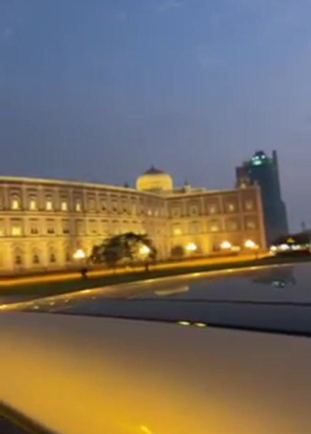 large, ornate building lit up at dusk. The view is from inside a car, looking through the sunroof. The building is rectangular with multiple stories and a dome on top. It is beige and has many windows. There are lampposts in front of the building. A modern high-rise building is visible in the background. The sky is a light blue. The video is slightly shaky.