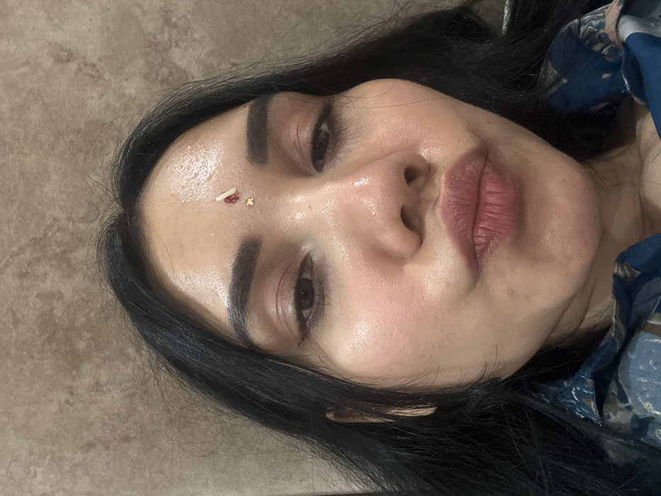 A close-up portrait photograph shows the head and upper torso of an adult female. Her dark hair frames her face. Her skin exhibits a sheen across the forehead, nose, and cheeks. A bindi is present on her forehead, consisting of a small red dot, a white elongated grain, and a small golden flake. Her dark eyes are open with visible eyeliner. Her lips are puckered. She wears a patterned garment with a blue base color. The background is an out-of-focus, light brown or beige textured wall. The scene is indoors. The specific location in the city of Howrah, India, cannot be determined from the image.
