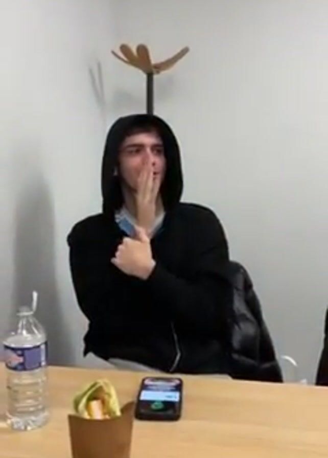 A young man sits at a wooden table in a room with white walls. He is wearing a black hoodie and has his hands clasped in front of him. On the table, there is a bottle of water, a phone, and a cup containing some kind of food. The man looks at the camera and appears to be smiling, though his mouth is covered by his hands. Behind him is a black jacket.