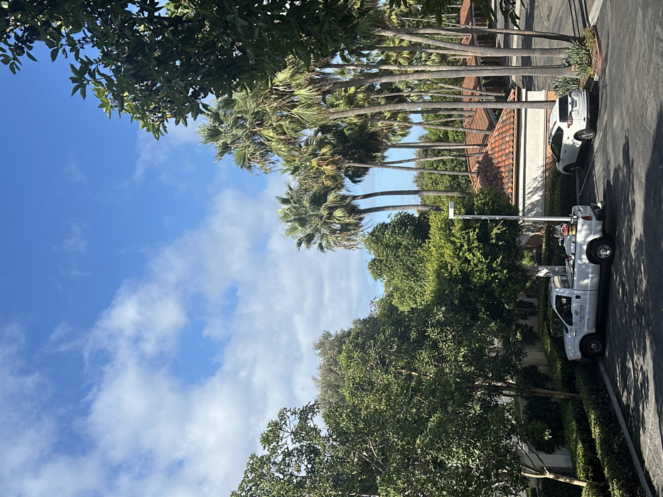This image captures an outdoor scene in Newport Beach, United States, under a partly cloudy blue sky. The foreground features an asphalt parking lot with shadows cast by visible objects and unseen structures, indicative of bright daylight. A white Ford F-series pickup truck, labeled "Earthco," is parked on the left side of the frame, fitted with a utility bed containing a red container, likely a fuel tank, and other equipment. To the right of the truck, a white SUV is also parked. A tall, slender light pole is positioned between the parked vehicles and the background. The scene is heavily landscaped with abundant green foliage, including numerous tall palm trees with exposed trunks and dense clusters of broadleaf trees. A low-rise building featuring a terracotta tile roof, consistent with Spanish or Mediterranean architectural styles, is partially visible through the trees in the midground. No people are present.