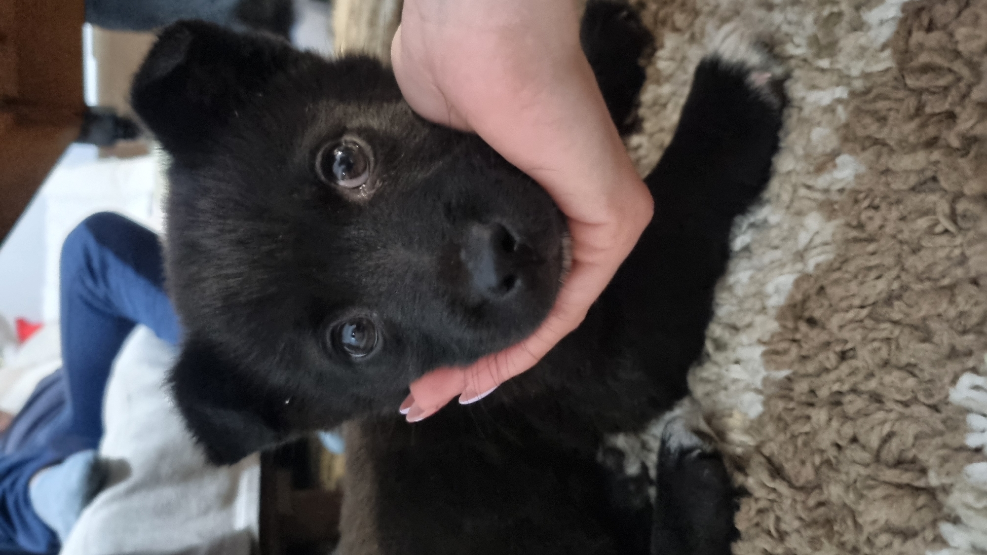 A close-up indoor shot reveals a small, black puppy being held by a person. The puppy, with shiny eyes and floppy ears, is lying on a shag rug with brown and white patterns. A partially visible person wearing blue pants sits in the background to the left. The location is Unknown, Unknown.
