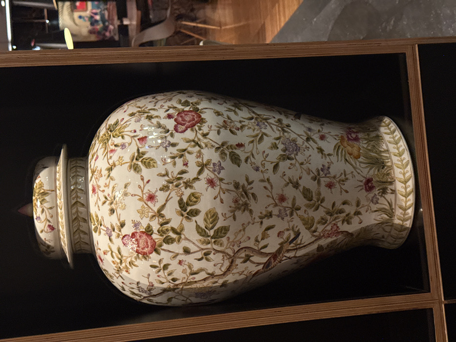 A large, decorative vase with a bulbous body rests inside a dark, framed display case. The vase is predominantly white with an elaborate floral pattern featuring red and purple flowers interspersed with green leaves and thin branches. The top and bottom of the vase have ornamental bands with a leaf design. A small bird is visible near the bottom of the vase.