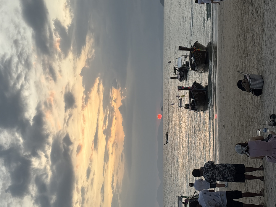 The scene depicts a sunset at a beach in Ban Ao Nang, Thailand. The horizon features a large, distinct red sun partially obscured by distant landmasses. The sky is largely overcast with grey clouds, interspersed with areas of yellow and orange light from the setting sun, particularly near the horizon. The sea surface reflects the ambient light, showing gentle waves. In the mid-ground of the water, two traditional Thai longtail boats are anchored or beached in shallow water on the right, displaying their characteristic prows. A third longtail boat is visible further out in the center-left, moving horizontally across the frame. Additional smaller boats and distant land are discernible on the horizon. The sandy beach in the foreground and mid-ground is populated by several individuals. In the mid-ground, three men are standing with their backs to the viewer, observing the sea and sunset. One man on the far left wears a patterned light shirt and dark shorts. Adjacent to him, another man wears a light-colored short-sleeved shirt, and to his right, a third man wears a dark, patterned short-sleeved shirt. Further to the right, a person is partially visible, wearing a light-colored shirt. In the immediate foreground, a person is seated on the sand with their back to the viewer, wearing a light pink dress and a light-colored headscarf. To their right, a checkered bag and a dark bag are placed on the sand. Near the seated individual, plastic cups and a dark object, possibly footwear, are visible on the sand. The overall lighting is dim, characteristic of dusk.