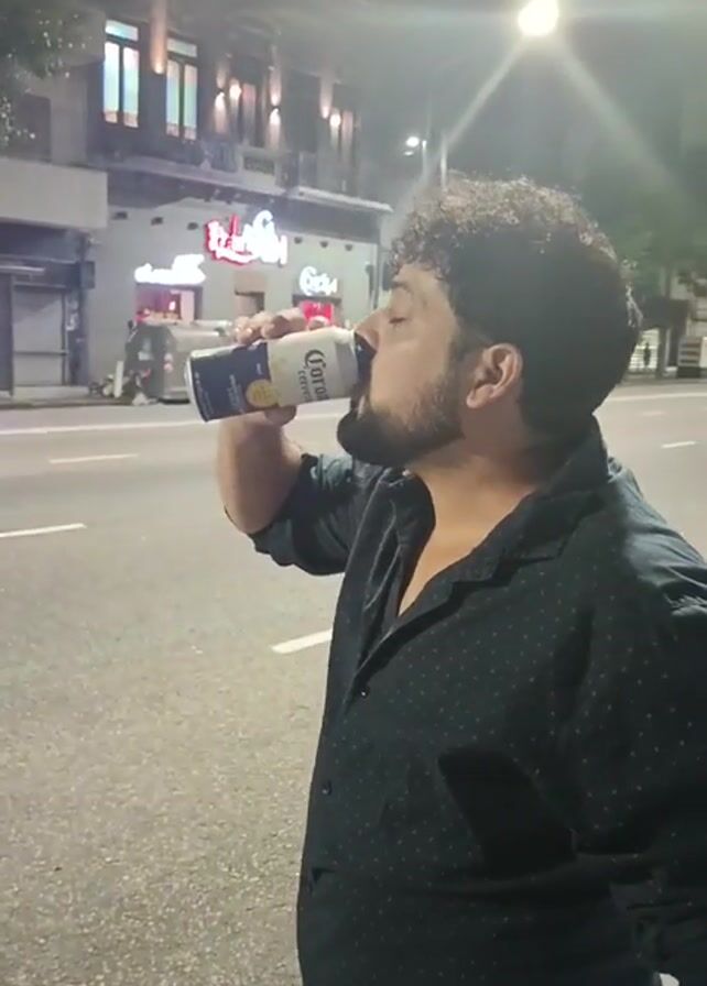 A man with dark curly hair and a beard is drinking from a can of Corona beer while standing on a street at night