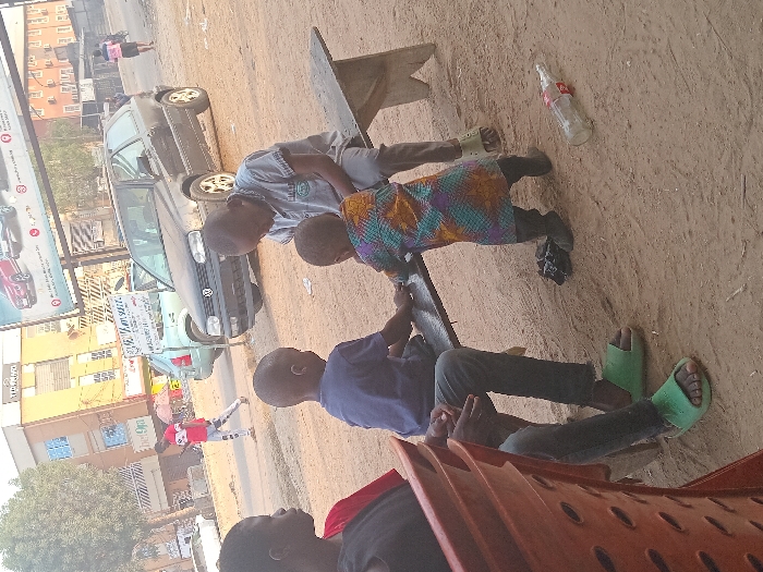 Three children sit on benches outside, observing something intently. One wears a blue shirt and gray pants, sporting green sandals. Another is clad in a patterned shirt, while the third has on a button-down shirt and pants. A discarded Coca-Cola bottle lies nearby on the ground. Cars and buildings are visible in the background, suggesting an urban setting.