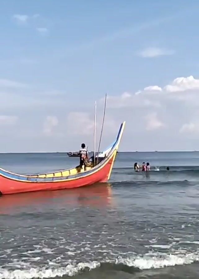 On a sunny day with a few clouds, a small, vividly colored boat sits in the water near a beach. The boat is primarily red with a yellow stripe along the top and a blue accent on the high, curved bow. A person stands on the boat, appearing to be working with ropes or other equipment. Several people are in the water nearby, some wading and others swimming. In the distance, another boat is visible on the horizon. The water is choppy with small waves, and the overall atmosphere suggests a coastal fishing or leisure scene.