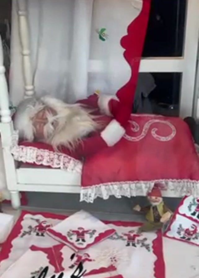 shop window display decorated with Christmas themes. A mannequin dressed as Santa Claus is lying in a white bed with red bedding adorned with lace and embroidered with an "S" design. A red curtain drapes next to the bed. On the floor of the display, there are embroidered placemats and napkins featuring Santa Claus designs. A small elf figurine sits near the bed. The text "Latly's Gift Shop 2023" is superimposed on the lower portion of the display. The lighting is bright, suggesting the scene is taken during the daytime.