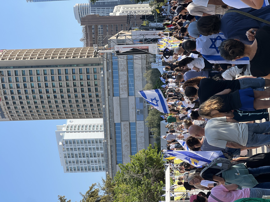 The image displays a large outdoor gathering of individuals on Kaplan Street in Tel Aviv, Israel, under a clear blue sky
