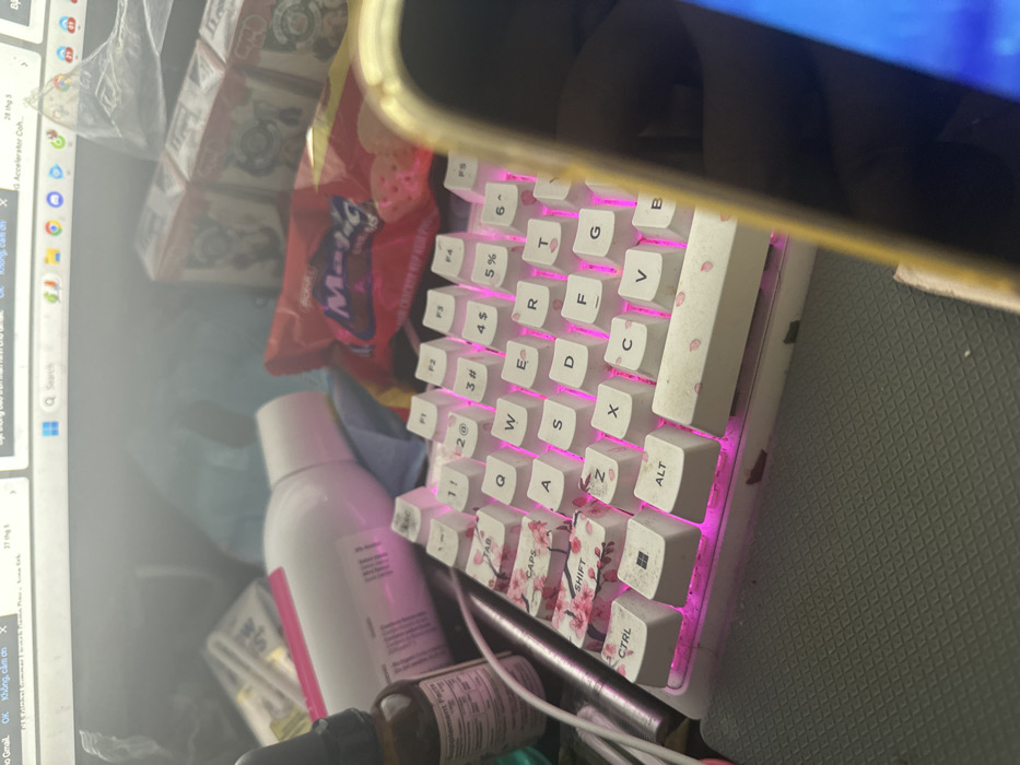 white mechanical keyboard with pink backlighting, with a floral pattern on the keycaps. The keyboard is on a grey desk surface, with other objects visible in the background, including a bottle, a phone, and a computer screen. The keyboard is in focus, with the other objects blurred in the background. The keyboard is lit up by a pink light. The scene is in Vũng Tàu, Vietnam, with the coordinates 10.366, 107.1.