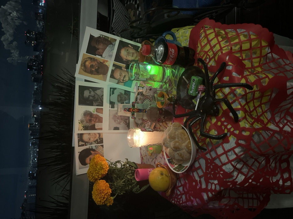 - "An *ofrenda* for Día de Muertos is meticulously arranged on a table, likely on a balcony or near a window overlooking the nighttime cityscape of Mexico City, Mexico" by FM-21Qs12, licensed under CC BY 4.0