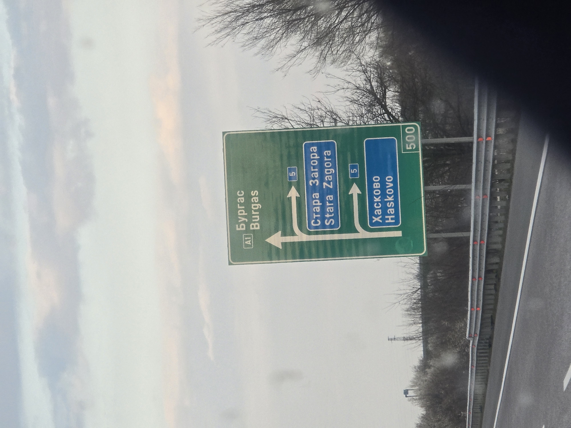 This image presents a daytime view from within a vehicle traveling on a multi-lane highway in Kaloyanovets, Bulgaria. The sky is overcast, appearing as a uniform grey-white. A large rectangular green highway sign stands centrally, oriented towards the viewer. The sign features white Cyrillic and Latin text, along with directional arrows. From top to bottom, the sign indicates: * "A1 Бургас / Burgas" with an upward-pointing arrow. * A right-curving arrow leading to a blue rectangle displaying "5 Стара Загора / Stara Zagora". * A right-curving arrow leading to a blue rectangle displaying "5 Хасково / Haskovo". The number "500" is visible in white text on the bottom right corner of the green sign. The asphalt highway surface occupies the lower foreground, featuring a solid white lane line on the left and a dashed white lane marker. A silver metal guardrail, equipped with evenly spaced circular red reflectors, runs parallel to the road on the left side. Beyond the guardrail and to the right of the highway sign, bare deciduous trees and shrubs are visible, indicative of a cooler season. A utility pole or transmission tower is faintly discernable in the far left background. The lower right quadrant of the image is partially obscured by an amorphous dark shape. No individuals are present in the scene.
