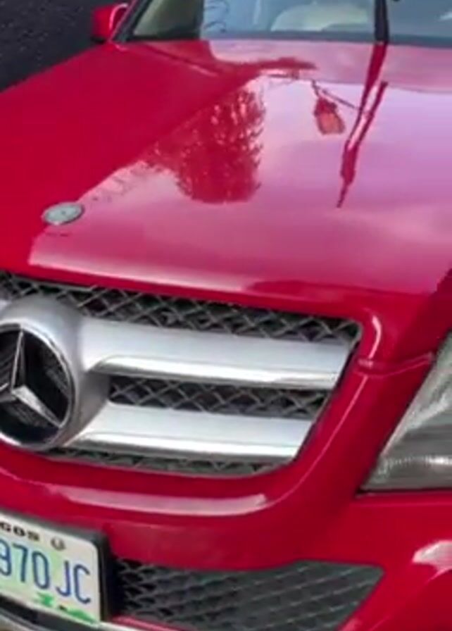 red Mercedes-Benz GLK SUV being washed. The camera pans from the front of the car, featuring the grille and Lagos license plate, along the side, highlighting the red exterior, chrome trim, wheels, side mirror, roof rack, and a glimpse of the light-colored interior. The car is parked in what appears to be a car wash area, with a dark wall visible in the background.