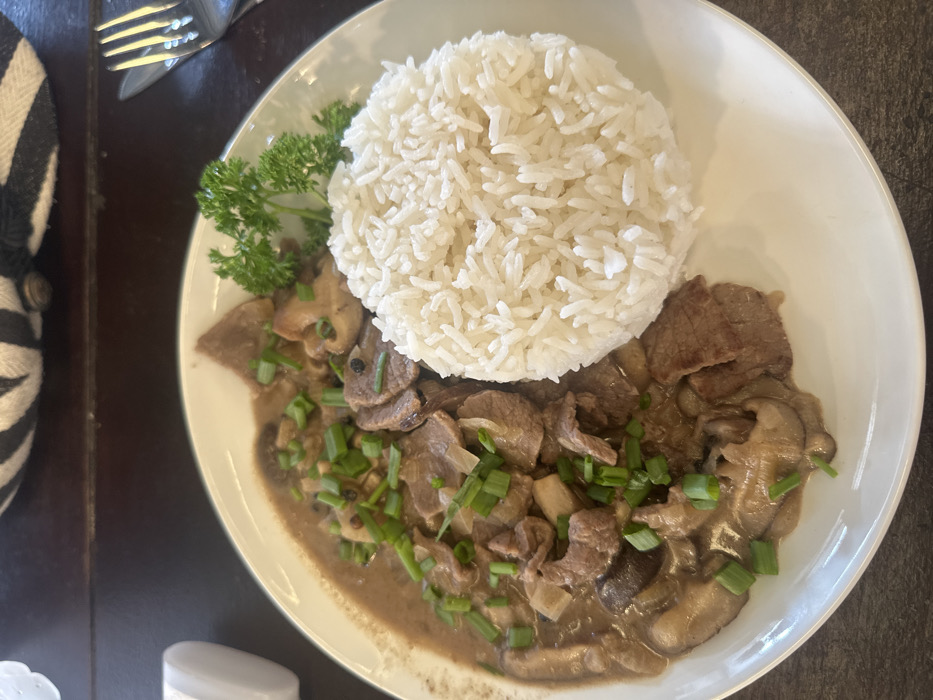 A white oval plate containing a meal is centered on a dark brown surface, likely a wooden table, in Moo 1, Thailand. The plate holds a portion of white, long-grain rice shaped into a dome on the right side. To the left of the rice is a beef and mushroom stew or stir-fry in a light brown, viscous sauce. The stew contains thinly sliced pieces of browned beef, whole or halved brown mushrooms, and translucent slices of onion. The dish is garnished with numerous chopped green onions or chives scattered across the surface, along with visible whole black peppercorns. A small sprig of fresh green parsley is placed at the top right edge of the stew, adjacent to the rice. In the upper left background, a portion of a white, possibly plastic, container is visible. In the upper right background, a silver fork and knife are partially visible. A blurred object with a black and white striped pattern is also present in the upper background, behind the plate. No people are visible.
