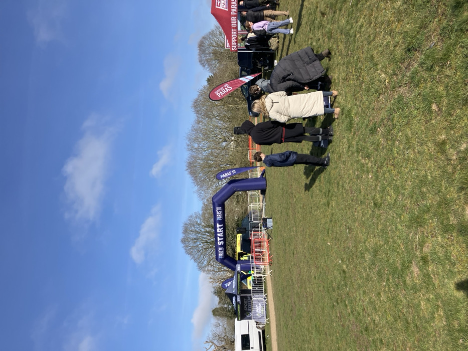 The image captures an outdoor event situated on a large, open grassy field under a bright, clear blue sky with minimal scattered white clouds. The location is Abbey Field in Colchester, United Kingdom. In the mid-ground, a prominent blue inflatable arch serves as a start line, displaying "PARAS'10 START PARAS'10" in white text. To the arch's immediate left, a black gazebo is erected, branded with "SPORT SYSTEM Timing & Results." A white panel van is parked behind this gazebo. Underneath the arch and slightly behind the gazebo, a yellow emergency vehicle (possibly an ambulance or medical support van) is positioned. An area delineated by white metal crowd control barriers and orange-red plastic barriers extends from the arch and gazebo. A small black speaker or piece of equipment rests on the grass near these barriers. To the right of the scene, a red gazebo is visible, partially obscured, bearing white text that includes "SUPPORT OUR PARAS." A matching flag banner stands beside it. Several dark-colored vehicles are parked behind this red gazebo. Approximately 10-15 individuals are dispersed throughout the mid-ground and right side of the frame, indicating active attendance at the event. In the immediate foreground, a cluster of five individuals stands on the grass. From left to right, a young boy in a blue jacket stands facing left. Next to him is an individual in a black hooded top and black leggings, facing away from the camera. A woman in a long, cream-colored puffer coat stands facing away. Adjacent to her, another individual in a dark puffer coat is bending forward, appearing to interact with something at ground level. Part of a fifth person is visible behind this group. The strong sunlight, originating from the left, casts distinct shadows of the people and objects onto the grass. The background features a line of mature deciduous trees, mostly bare of leaves, suggesting a late winter or early spring setting.