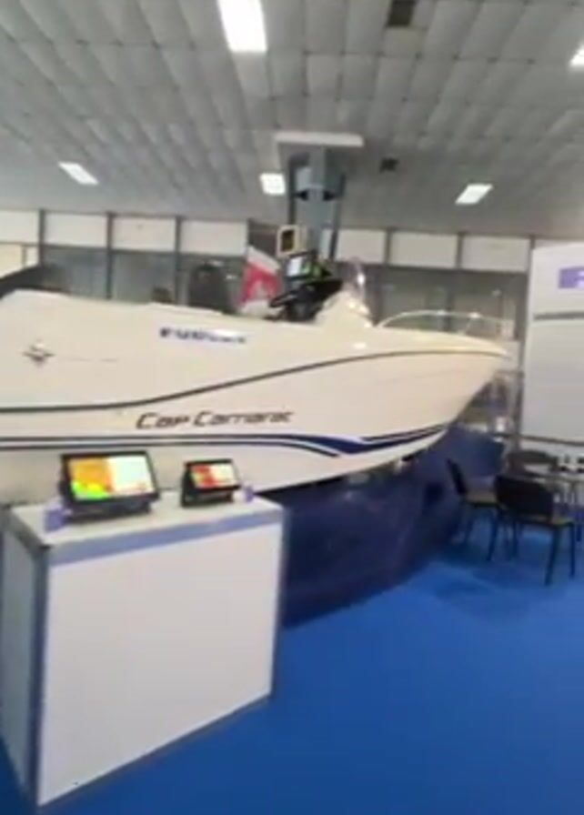 white motorboat on display at what appears to be a trade show or expo. The boat has blue stripes and the name "Cap Camarat" written on it. The boat also has the brand name "FURUNO" displayed. In front of the boat is a white display stand with two electronic screens on it, showing graphics that could be navigational data. The floor around the boat is covered in blue carpet. In the background, there is a table with chairs and more displays. The overall lighting is bright, suggesting an indoor setting with ample artificial light.