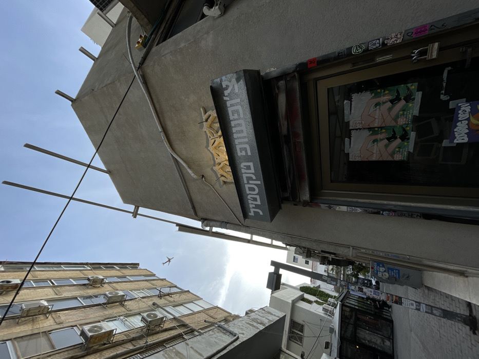 A low-angle shot capturing a narrow city street. Buildings line the sides, one adorned with air conditioning units. Above, a sign in Hebrew hangs over a storefront window plastered with posters. An airplane flies in the sky. The overall perspective is skewed, emphasizing the confined urban space and verticality of the structures.