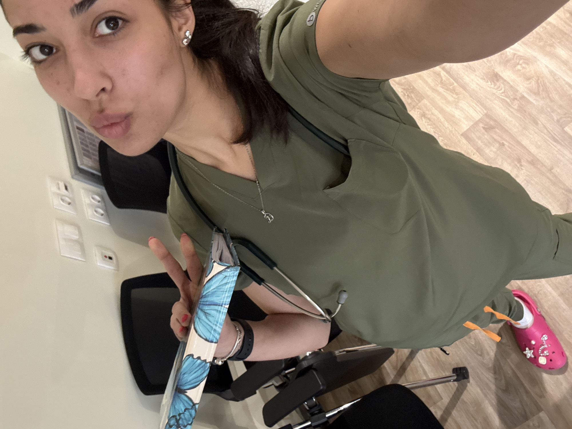 A female individual is depicted indoors in Sofia, Bulgaria, posing for a self-portrait. She is positioned facing the camera with her head tilted, lips puckered, and her right hand raised to form a "peace" sign. Her fingernails are painted red. She wears olive green medical scrubs, a dark stethoscope draped around her neck, and a silver necklace with a small pendant. Her left wrist displays a dark smartwatch and a silver bracelet. She holds a folder with a blue butterfly pattern in her left hand. Her feet, visible at the bottom of the frame, are clad in pink Crocs adorned with decorative charms, worn over white socks. The background consists of a light-colored wood laminate floor and an off-white wall featuring multiple white electrical outlets and light switches. Several dark office chairs with metal frames are partially visible behind her, suggesting a clinic or office environment.