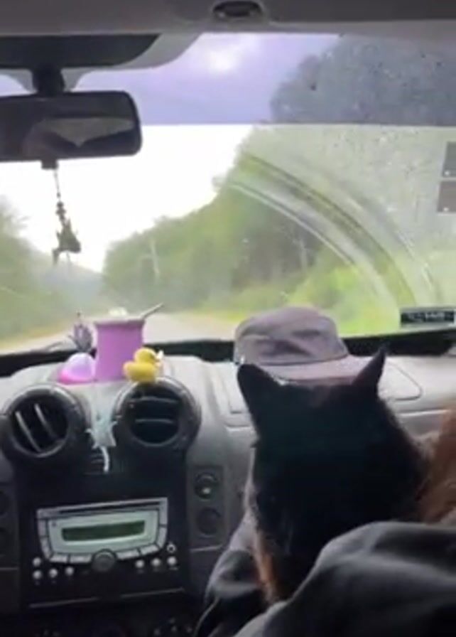A black cat sits in the lap of a person in the passenger seat of a car. It is raining. The windshield wipers are on. The car is moving down a road lined with trees. The car radio is visible. A purple cup and a yellow rubber duck sit on the dashboard. A baseball cap also sits on the dashboard. The cat is looking towards the windshield. The person is wearing a gray hooded sweatshirt.