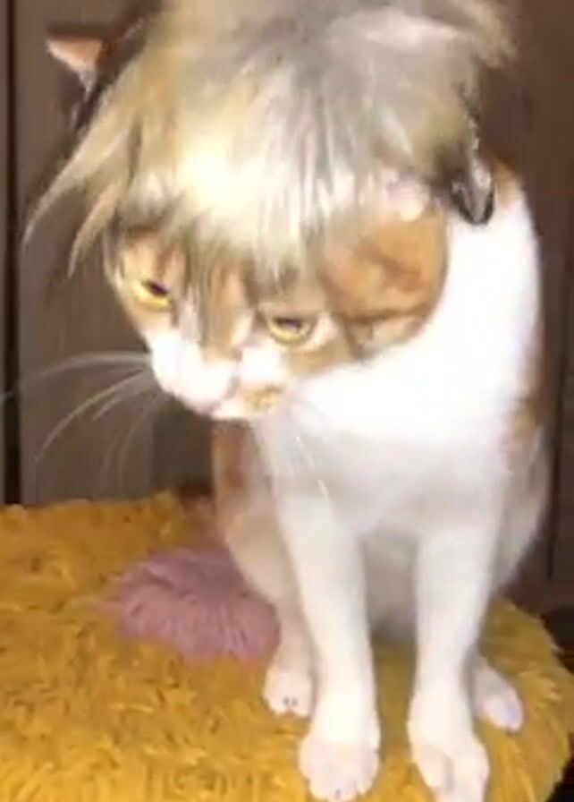 A cat wearing a blonde and gray wig and one dangly earring sits on a yellow fluffy perch. The cat is mostly white with orange patches, and looks sad. In the background is a messy, cluttered surface.
