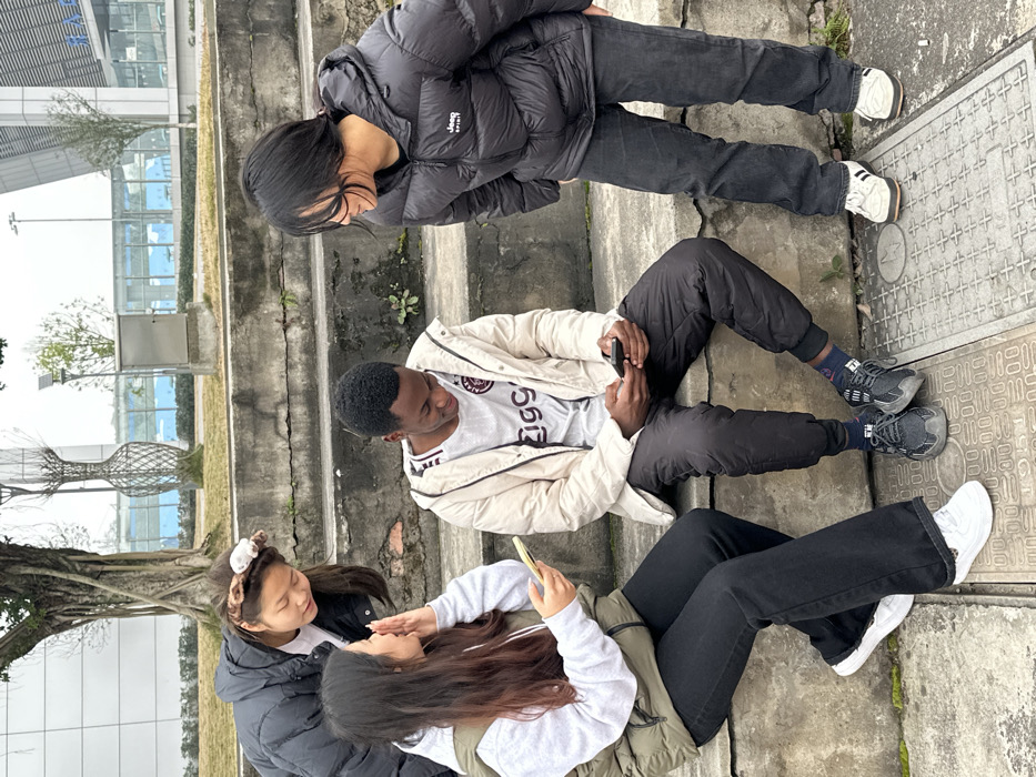 Four young adults are casually seated on concrete steps outdoors. One person wears a black puffer jacket and dark jeans, peering down. Below, another person in a white jacket and soccer jersey looks at a phone. The bottom two are partially visible; one wearing a white sweater and another a grey jacket. They also appear to be looking at phones. The setting seems to be an urban area near a building with glass windows. A tree is visible on the left.