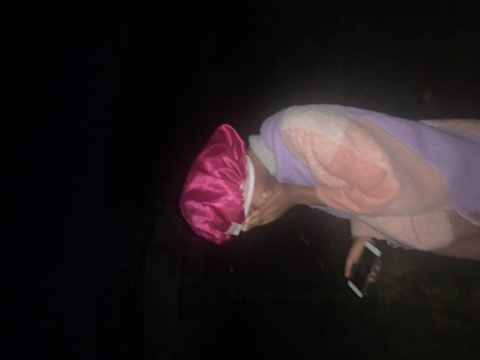 A person wearing a pink satin bonnet and a pink and purple robe stands in the dark. They are holding a black smartphone in one hand and covering their face with the other hand. The surrounding environment is dark, with minimal visibility.