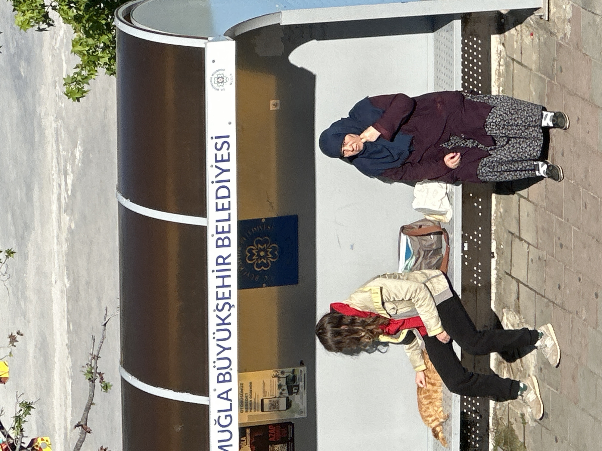 At a bus stop in Fethiye, Turkey, a woman wearing a dark blue hijab and a dark dress with a floral skirt is lying down on the bus stop bench. Below her on the bench, there is a small white bag and a brown purse. A second woman wearing a red shirt, a tan jacket, and black pants is sitting down on the ground next to the bus stop, petting an orange cat that is next to her. The bus stop is made of metal and has a large sign with the words "MUGLA BUYUKSEHIR BELEDIYESI" written in white letters. A bulletin board is behind the second woman and has various posters.
